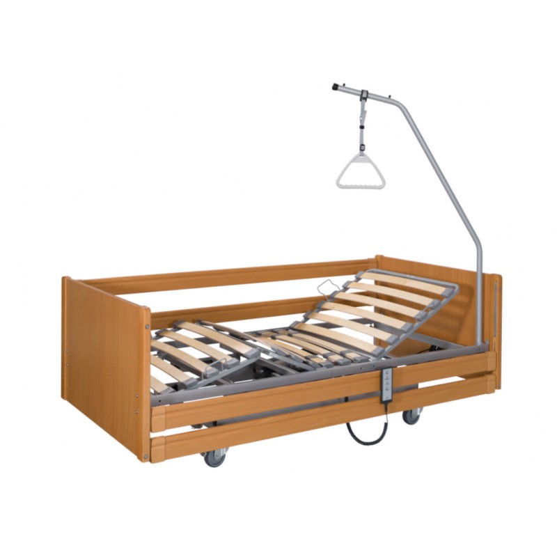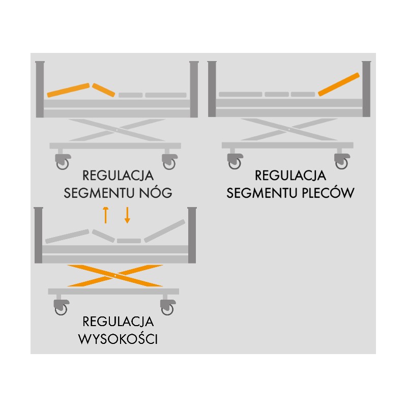 Istotnym elementem jest możliwość regulacji wysokości leża w zakresie od 39 cm do 80cm co ma kolosalne znaczenie dla komfortu użytkowania. Dodatkowo leże składa się z czterech niezależnych segmentów, które można ustawiać w zależności od potrzeb pacjenta. Bardzo proste i wygodne sterowanie za pomocą zintegrowanego pilota. Dodatkowo każdą funkcje można osobno zablokować. Łóżko wyposażone jest w niezbędne akcesoria jak wysięgnik z uchwytem o podwyższonej wytrzymałości. Na wysięgniku można zamontować płyny infuzyjne.