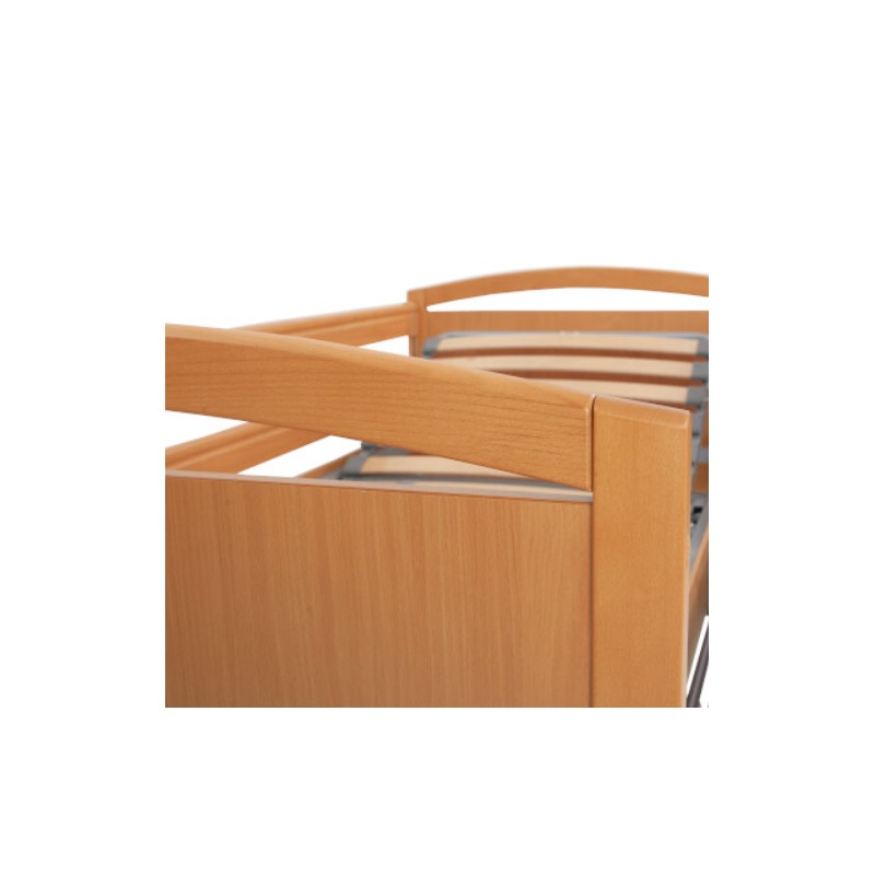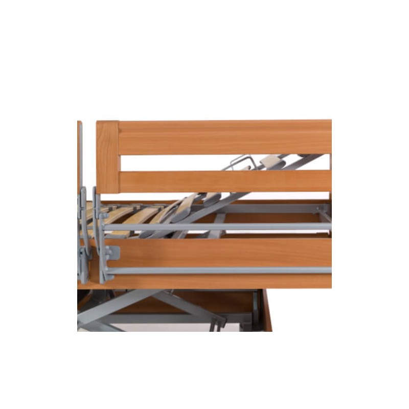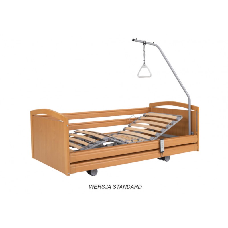 Kolejnym atutem jest dzielona barierka, która jest składana - opuszczana. Ma to na celu poprawić bezpieczeństwo rehabilitacji osób oraz umożliwić bezproblemowe poruszanie się na łóżku. Dodatkowo ten model mebla posiada w górnej części solidny zintegrowany wysięgnik z uchwytem wspomagający podnoszenie się seniora czy osoby rehabilitowanej.