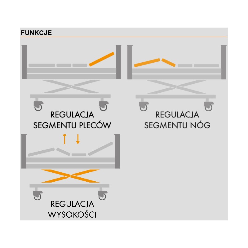 Łóżka z prezentowanego modelu posiadają w pełni regulowane, 4-segmentowe leże. Dodatkowo produkt ten posiada funkcję elektrycznego sterowania za pomocą pilota. W standardzie jest też komplet poręczy bocznych i wysięgnik na płyny infuzyjne. Koła w prezentowanym modelu łóżka są blokowane niezależnie. Regulacja nastawienia wysokości leża jest w granicach 40 cm – 80 cm ponad powierzchnią podłoża. Pełna specyfikacja dostępna jest w dokumencie do pobrania poniżej lub w naszym dziale obsługi. Zachęcamy do kontaktu telefonicznego lub mailowego w celu uzyskania niezbędnych informacji.