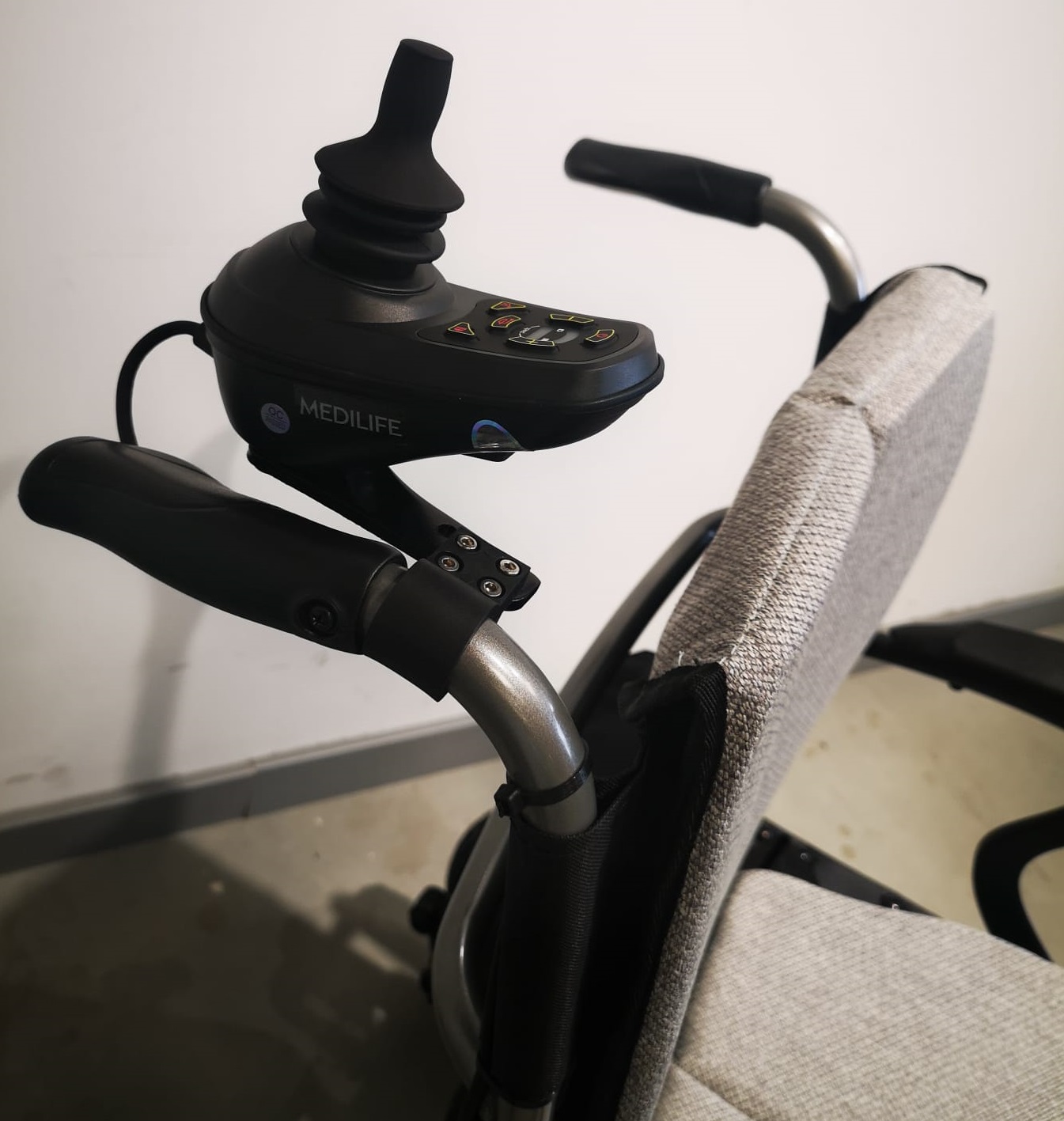 Medilife O2 posiada opcję dodatkową przełożenia sterowania na tył wózka, zapewnia to możliwość prowadzenia wózka przez opiekuna (Opcja dodatkowa prosimy o kontakt telefoniczny lub wiadomość email odnośnie szczegółów !).