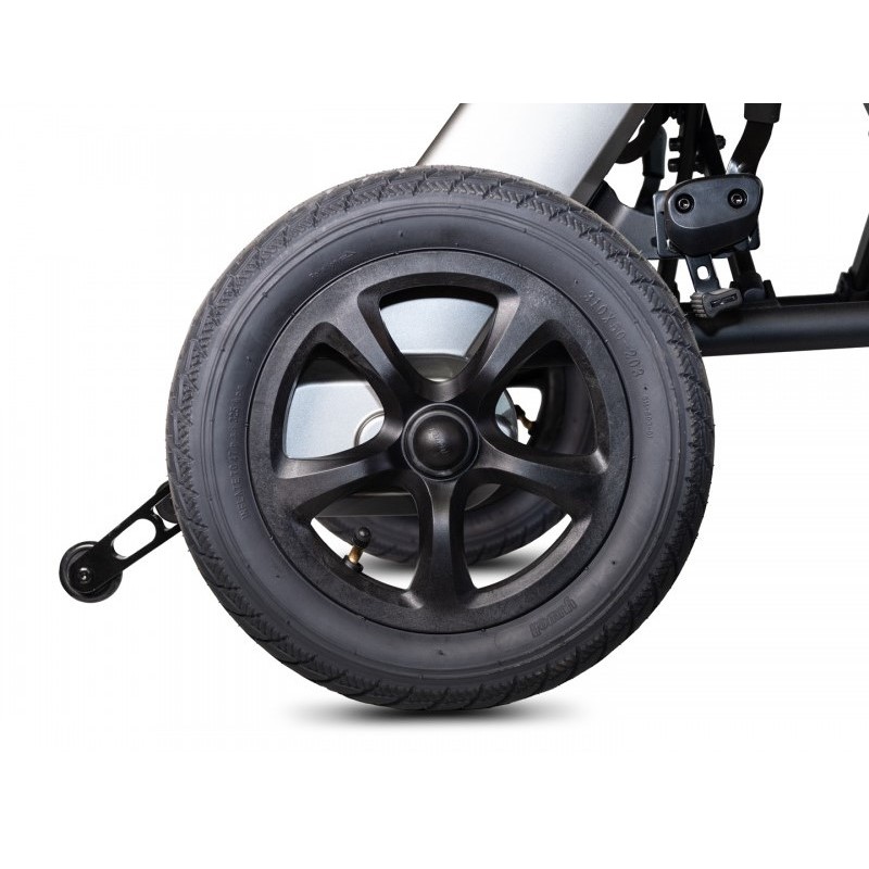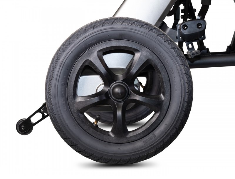Wózek napędzają dwa ciche silniki o mocy 130W oraz wydajne baterie litowo-jonowe 2 × 24V 5,2Ah, które zapewniają zasięg do 20 km. Nowoczesny system hamulcowy – elektroniczny i postojowy – oraz oświetlenie LED zwiększają bezpieczeństwo i komfort jazdy.