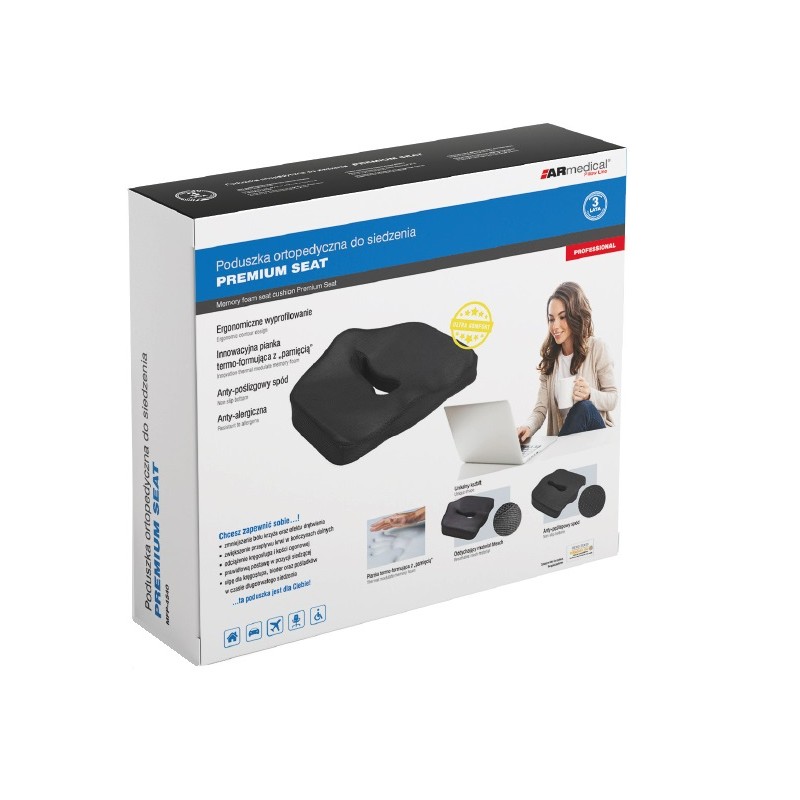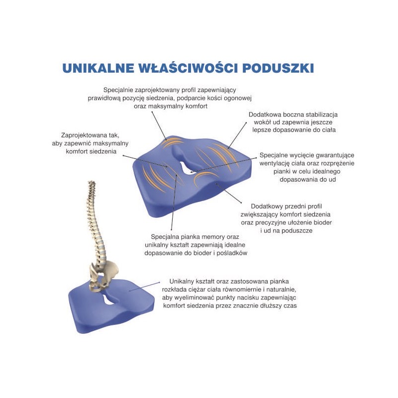 Wykonana z innowacyjnej termo-formującej pianki z „pamięcią kształtu”. Dzięki temu idealnie dopasowuje się do anatomicznych kształtów ciała. Wspomaga prawidłowe ułożenie kręgosłupa osobom, które spędzają dużo czasu w pozycji siedzącej np. na wózku inwalidzkim, twardym krześle. Stanowi odciążenie dla kości ogonowej, pośladków oraz ud redukując efekt drętwienia, poprzez zwiększenie przepływu krwi w kończynach dolnych. Koryguje nieprawidłową postawę podczas siedzenia, dzięki czemu redukuje bóle szczególnie w odcinku krzyżowym kręgosłupa, spowodowane długotrwałym siedzeniem w nieprawidłowej pozycji. Przeznaczona jest dla osób wrażliwych na ucisk, np. osób po urazach stawu biodrowego, w procesie doleczania, czujących dyskomfort podczas siedzenia na twardej powierzchni. Dodatkowo może mieć zastosowanie jako oparcie dla kolan oraz nóg dając efekt relaksu „zmęczonych” nóg. Odpowiednie wyprofilowanie poduszki gwarantuje jej idealne przyleganie do ciała, dające odczucie dużego komfortu.
