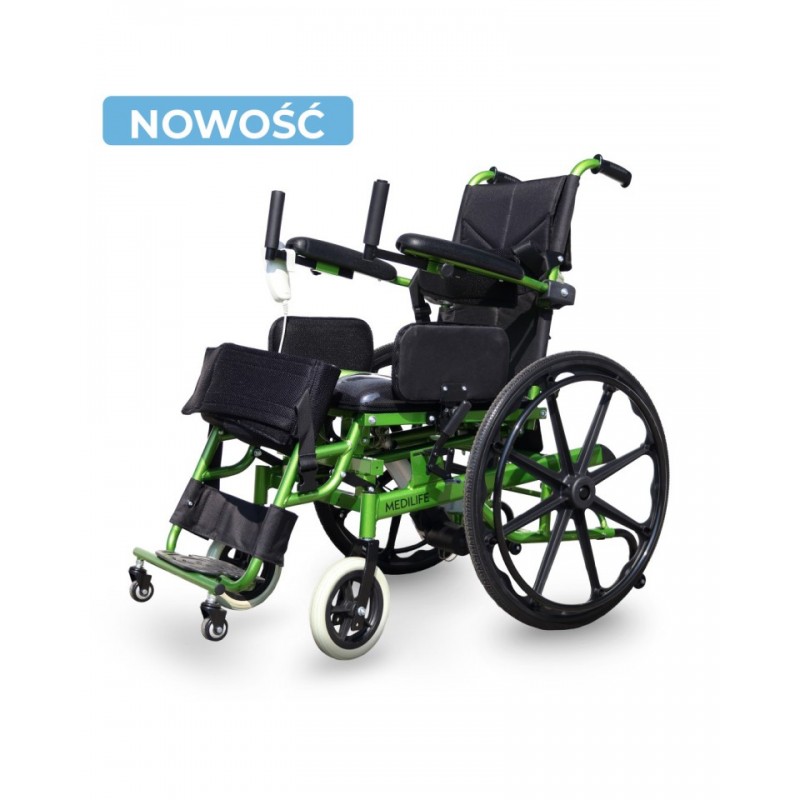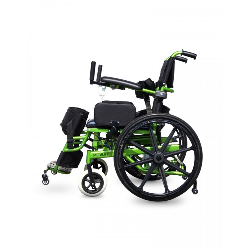 Solidna rama Medilife V5 została zaprojektowana z myślą o użytkownikach o wadze do 100 kg. Podnoszone podłokietniki z ergonomicznymi uchwytami ułatwiają pionizację. Wózek wyposażono w manualne hamulce oraz rączki dla opiekuna. Dla wygody transportu można łatwo odczepić oparcie oraz tylne koła, co umożliwia bezproblemowe umieszczenie wózka w bagażniku. Całkowita waga urządzenia to 33,5 kg.