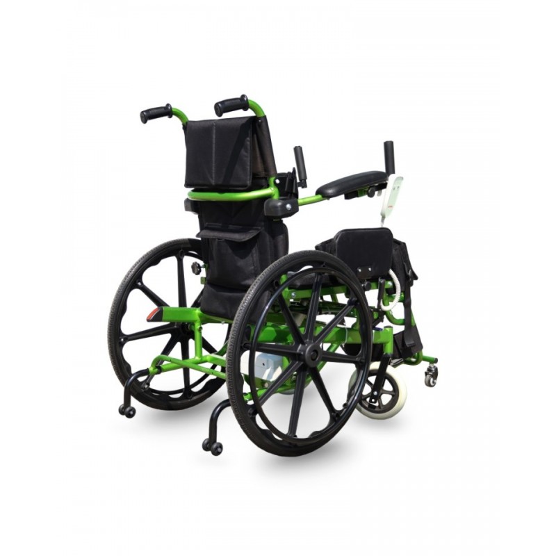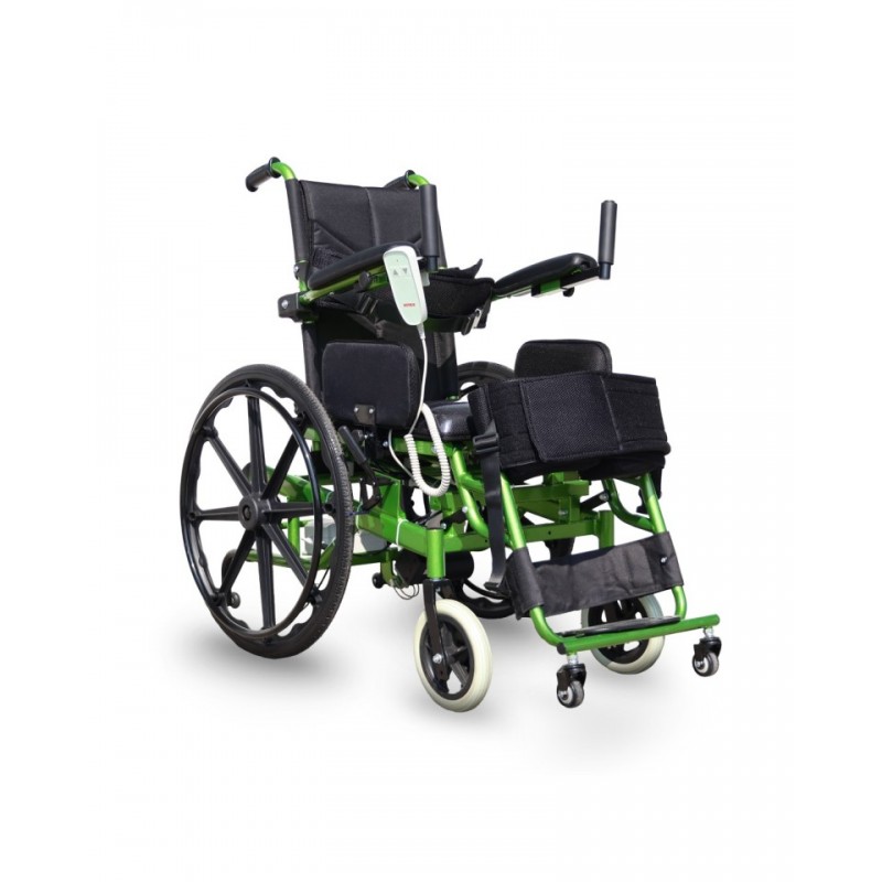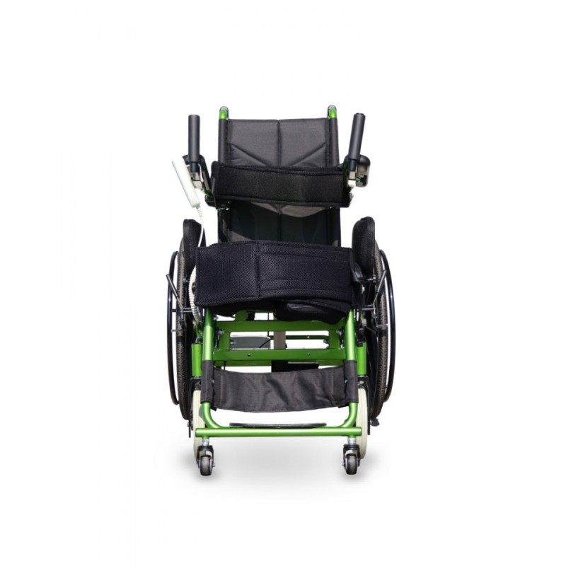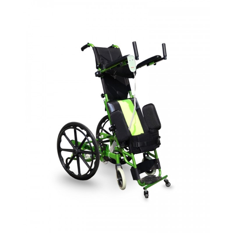 Pionizator posiada wygodne podparcie stóp i nóg, a także opaski stabilizujące z miękkimi poduszkami na uda oraz tors, zapinane na rzepy – niezbędne podczas pionizacji. Mechanizm regulacji pozycji jest prosty w obsłudze, a kontroler z dwoma przyciskami – „góra” i „dół” może być zamontowany po lewej lub prawej stronie. W zestawie znajduje się bateria o pojemności 2 Ah oraz ładowarka, którą można przechowywać w praktycznej kieszonce na oparciu.