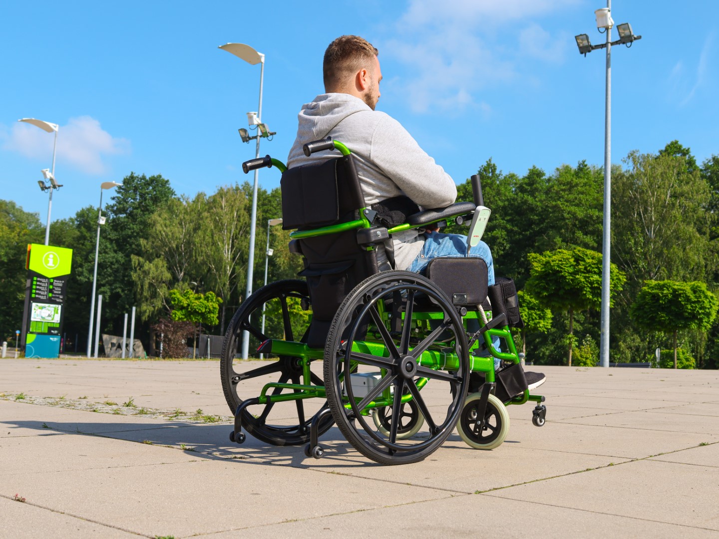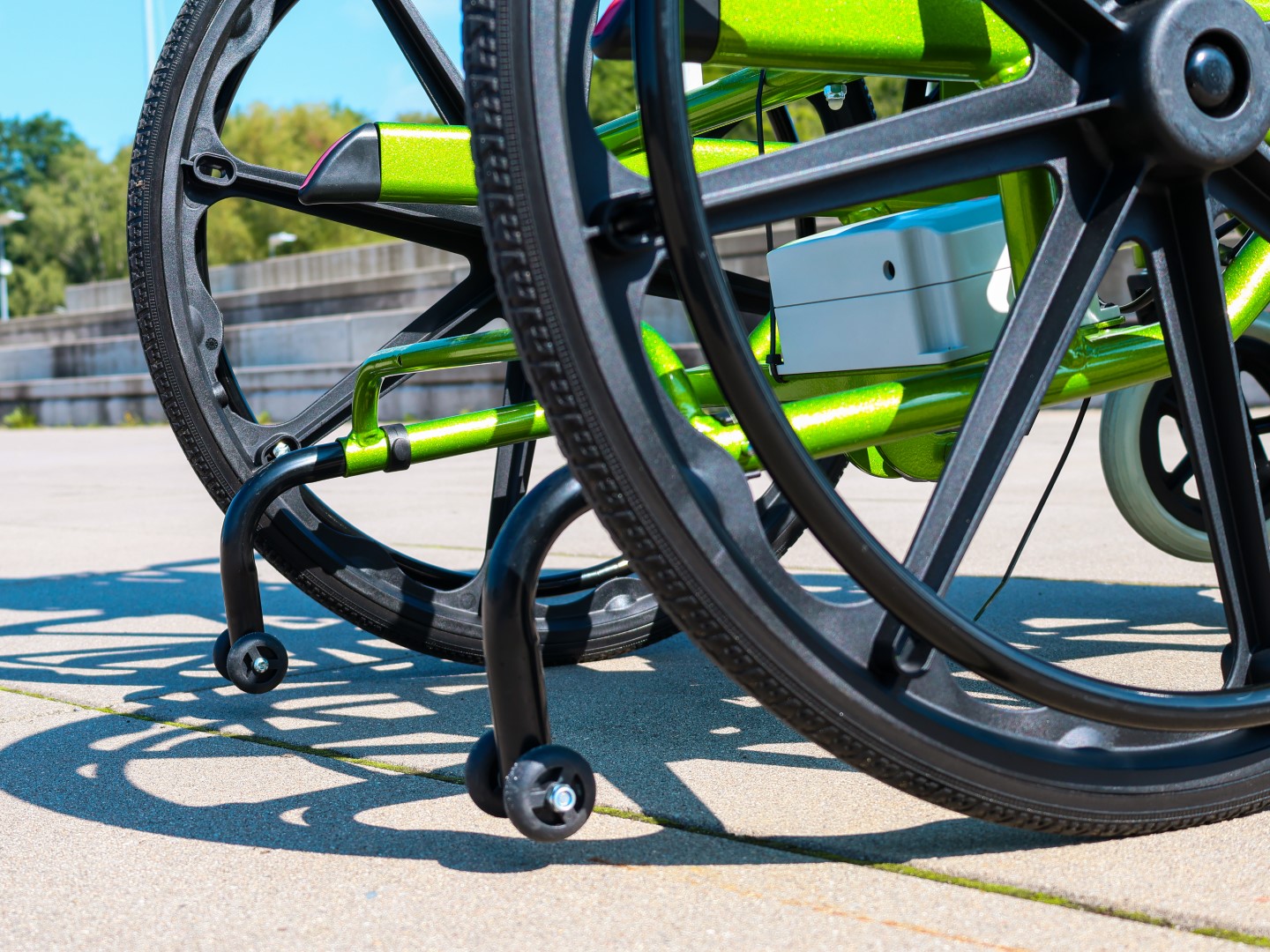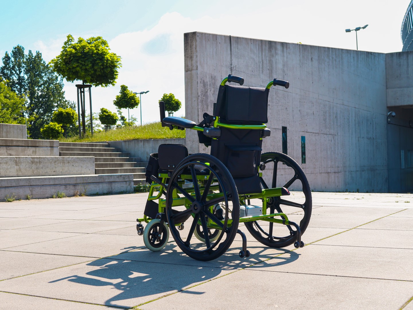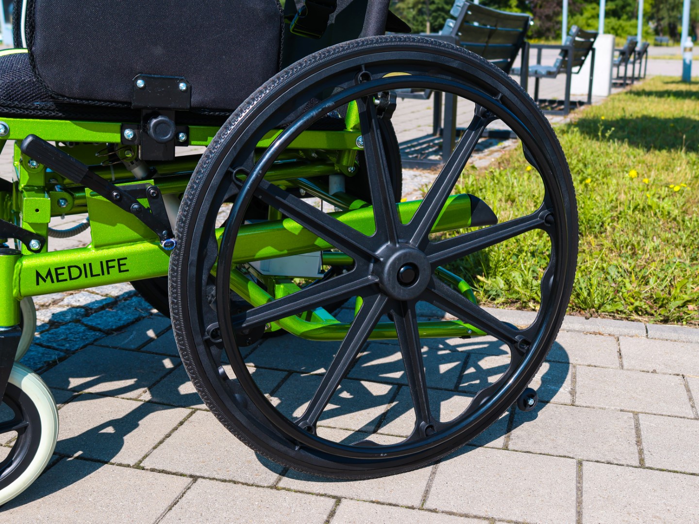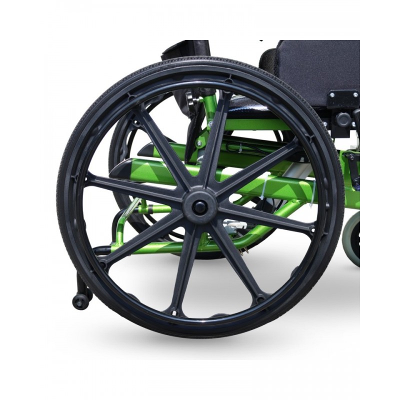 Medilife V5 posiada pełne 24-calowe tylne koła z opcją ręcznego napędu oraz 8-calowe, obracające się o 360° koła przednie, które gwarantują łatwe prowadzenie i manewrowanie. Pełne opony minimalizują ryzyko przebicia, a cztery dodatkowe kółka antywywrotne zwiększają stabilność oraz bezpieczeństwo – szczególnie podczas pionizacji.