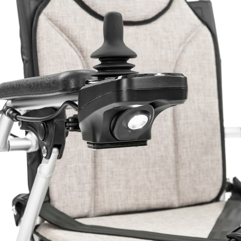 Moduł sterowania: przycisk włącz/wyłącz, podświetlenie przycisków, uniwersalny joystick, klakson, przyciski regulacji prędkości, wskaźnik stanu naładowania akumulatora