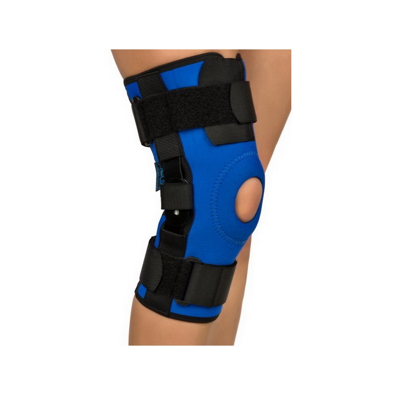 Orteza kolana K-04 typ otwarty z szynami dwuosiowymi, wykonana z termoaktywnego neoprenu.