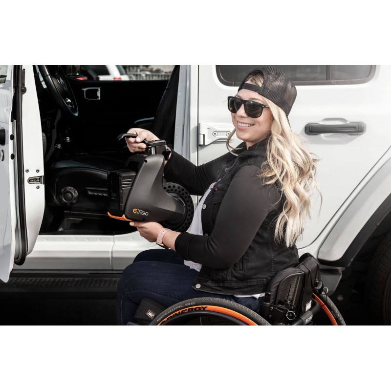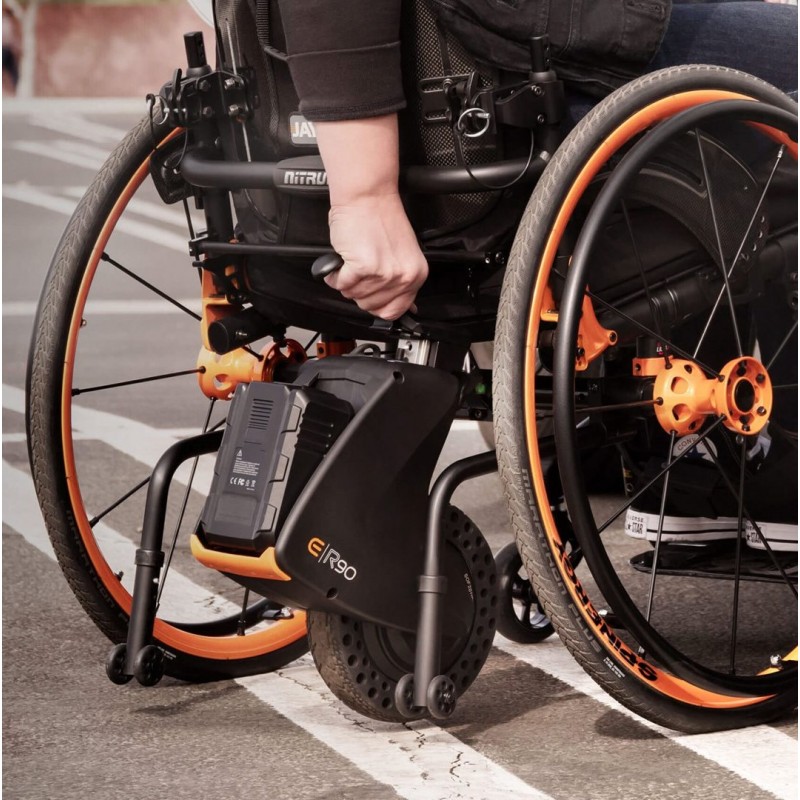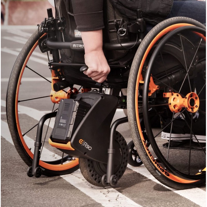 Elegancka, prosta i kompaktowa konstrukcja umożliwia umieszczenie R90 pod wózkiem. Jest niepozorny i intuicyjny, a także zachowuje rozmiar i promień skrętu wózka. System mocowania V-Lock zabezpiecza R90 do większości wózków na ramach składanych i sztywnych. Prosta skrzynka kontrolna umożliwia łatwą obsługę za pomocą przycisków i może być ergonomicznie ustawiona w celu łatwej obsługi. Gdy wspomaganie nie jest potrzebne, wystarczy nacisnąć przycisk, aby podnieść koło i uzyskać zerowy opór toczenia. Aplikacja Sunrise Intelligence pozwala wybrać profil wydajności, który najlepiej pasuje do danego środowiska.