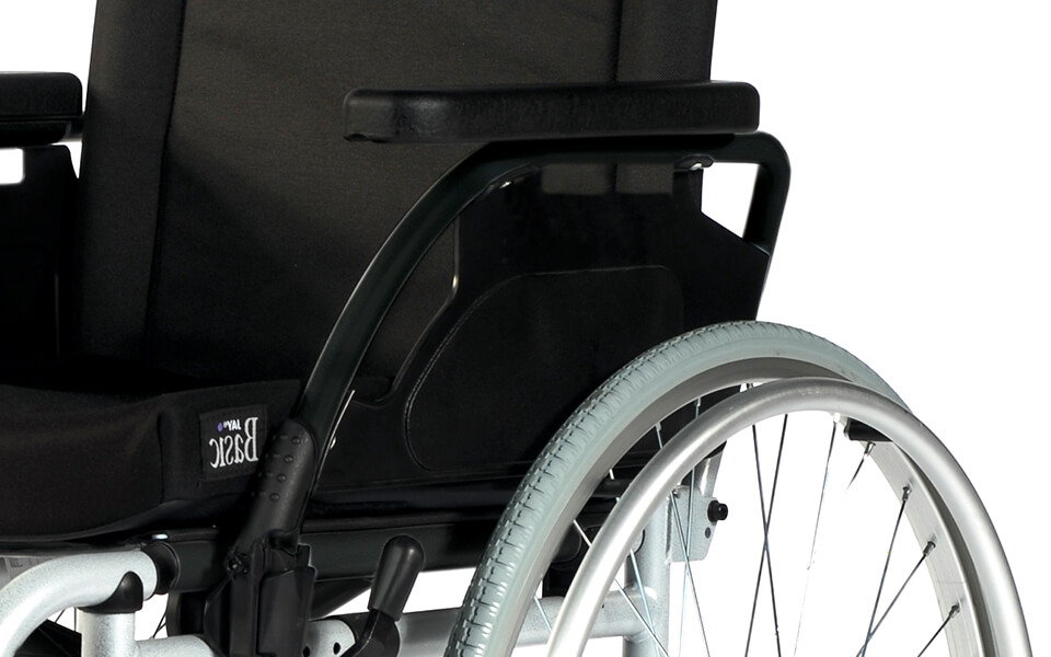 Regulowana nylonowa tapicerka i składane podłokietniki.