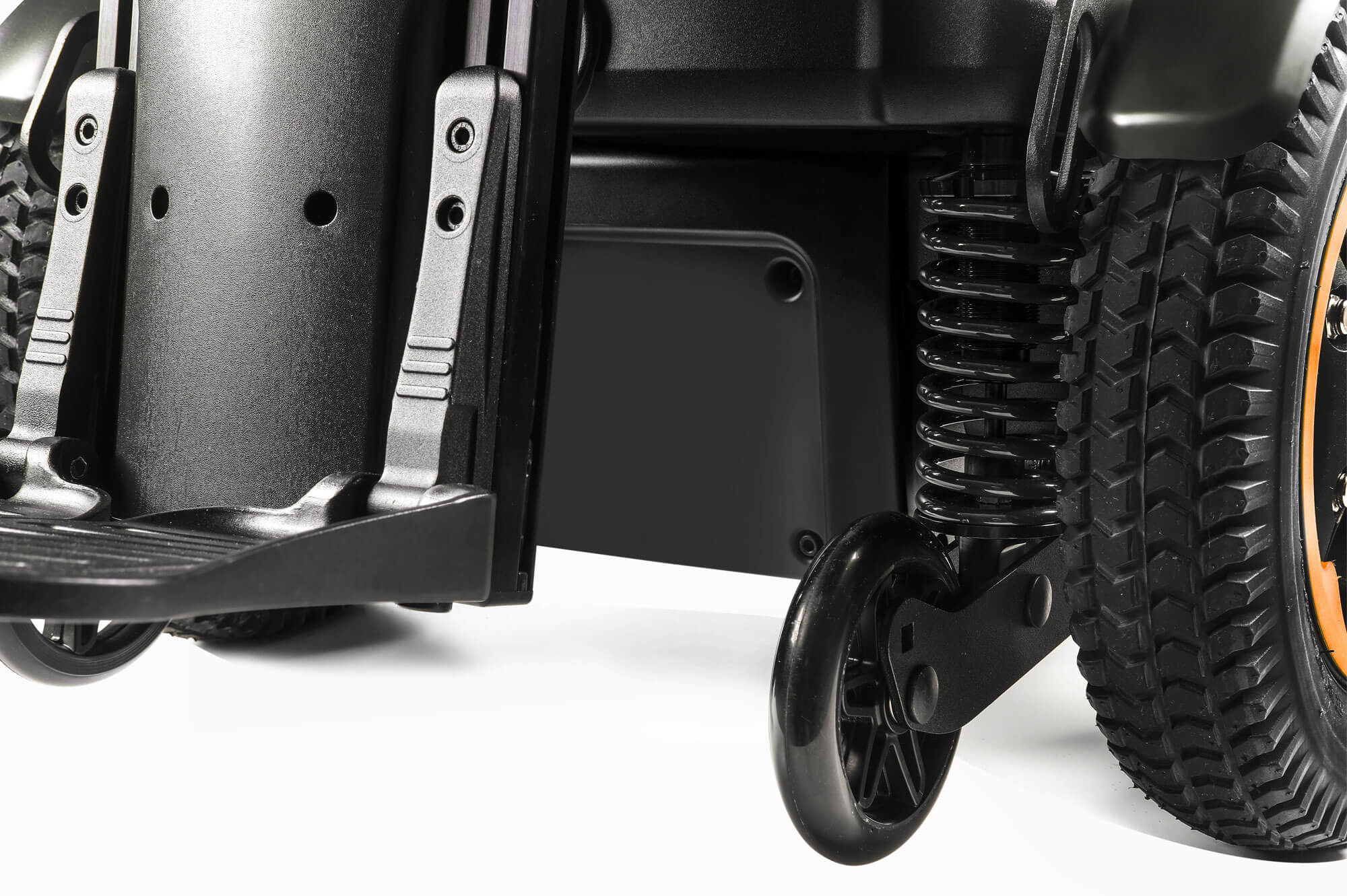 Łatwo (i wygodnie) pokonuj przeszkody dzięki niezależnemu amortyzowanemu zawieszeniu wszystkich kół. Podczas pokonywania codziennych wybojów tylne ramiona kółek niezależnie poruszają się w górę i w dół, dzięki czemu zaawansowane elastomerowe zawieszenie pochłania wibracje. Ponieważ koła napędowe znajdują się z przodu, jesteś również ciągnięty przez większe przeszkody (zamiast silników popychających Cię), co zapewnia płynniejsze jazdę i dalszą redukcję wibracji. Dodatkowo, ponieważ z przodu jest większy ciężar, wózek jest bardziej stabilny, jeśli często jeździsz nim w dół.