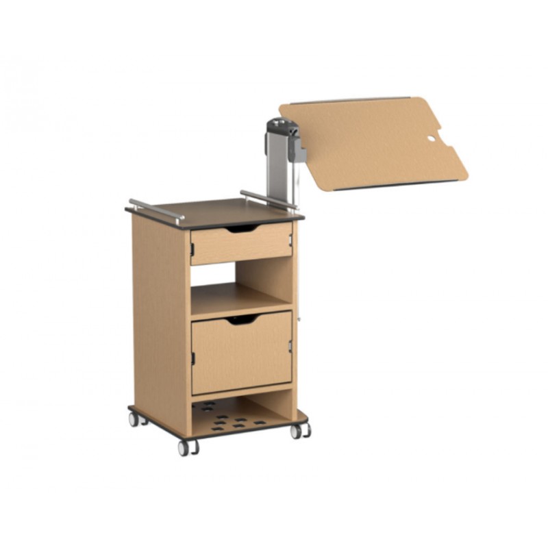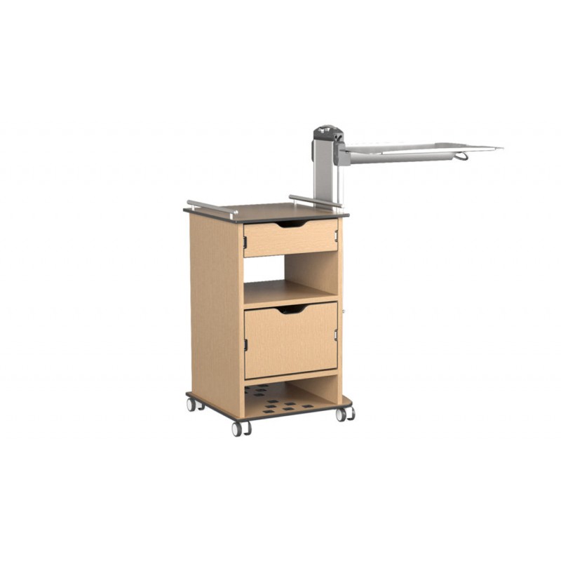 Korpus szafki wykonany jest z płyty CDF Swiss, która polecana jest szczególnie jako element konstrukcyjny mebli medycznych, gdzie wymagana jest trwałość i wytrzymałość powierzchni. Główne cechy tej płyty to: wodoodporność, trudnozapalność oraz odporność na zarysowania. Blat szafki oraz czoła szuflad wykonane są z wodoodpornego tworzywa – laminatu typu HPL. Wnętrze szuflady wyposażone jest w przegrodę i system odprowadzania wody. Takie rozwiązanie wpływa na komfort użytkowania oraz trwałość konstrukcji. Blat szafki. Blat szafki posiada szeroki zakres regulacji wysokości 750-1200mm, co umożliwia swobodny dostęp z pozycji siedzącej, a dwustronne pochylenie umożliwia stworzenie wygodnej podpórki np. do czytania. Regulacja wysokości blatu odbywa się płynnie i bezstopniwo dzięki zastosowaniu sprężyny gazowej.