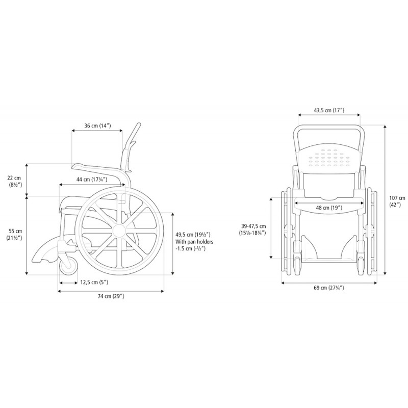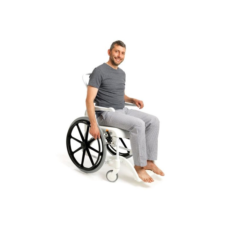 ETAC Clean wózek inwalidzki z funkcją toalety z kołami tylnymi 24”, który można stosować pod prysznicem (urządzenie wielofunkcyjne)
