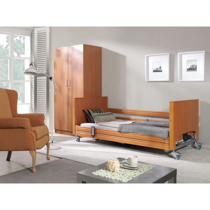 Łóżko rehabilitacyjne Elbur 337 wersja obniżona przeznaczone jest do rehabilitacji i pielęgnacji pacjentów w domach oraz ośrodkach opiekuńczych jak i w szpitalach. Dzięki swoim drewnianym elementom w kolorze buku, drewnianym frontom oraz częściom metalowym malowanym proszkowo w kolorze srebrnym to wysokiej jakości łóżko pielęgnacyjne doskonale komponuje się z otoczeniem. Powierzchnia leża wypełniona jest listwami sprężynującymi. Leże podzielone jest na 4 segmenty i posiada 2 pojedyncze silniki sterowane indywidualnie, a ponadto regulowany segment podudzia poprzez mechanizmy zapadkowe.Komfortowe sterowanie łóżka realizowane jest za pomocą pilota, posiadającego możliwość blokady poszczególnych pozycji łóżka. Na końcach barierek bocznych leża znajdują się sprężynujące nakładki z tworzywa sztucznego powodujące zmniejszanie odległości pomiędzy barierkami a frontem.